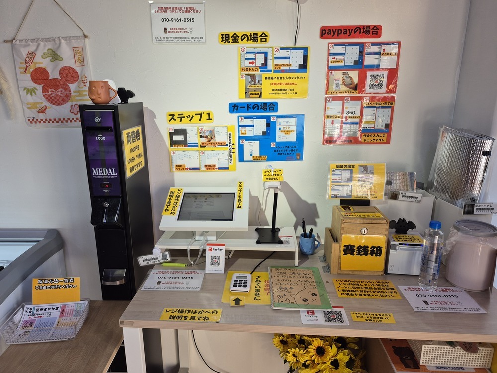 店内には1,000円札を小銭にできる両替機があり、さらにクレジットカードやPayPayなどのキャッシュレス決済にも対応!